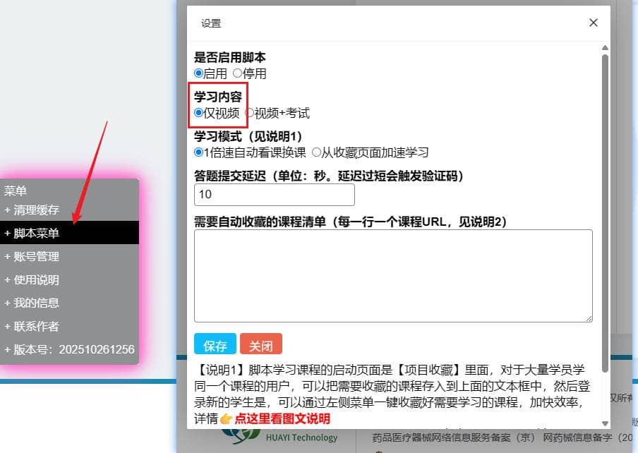 部分课程无法考试,或者考试需要刷脸等,可以设置为此模式,先用脚本去看视频,视频完成后再改回视频+考试模式,去刷脸考试(自己刷脸之后,脚本自动答题)