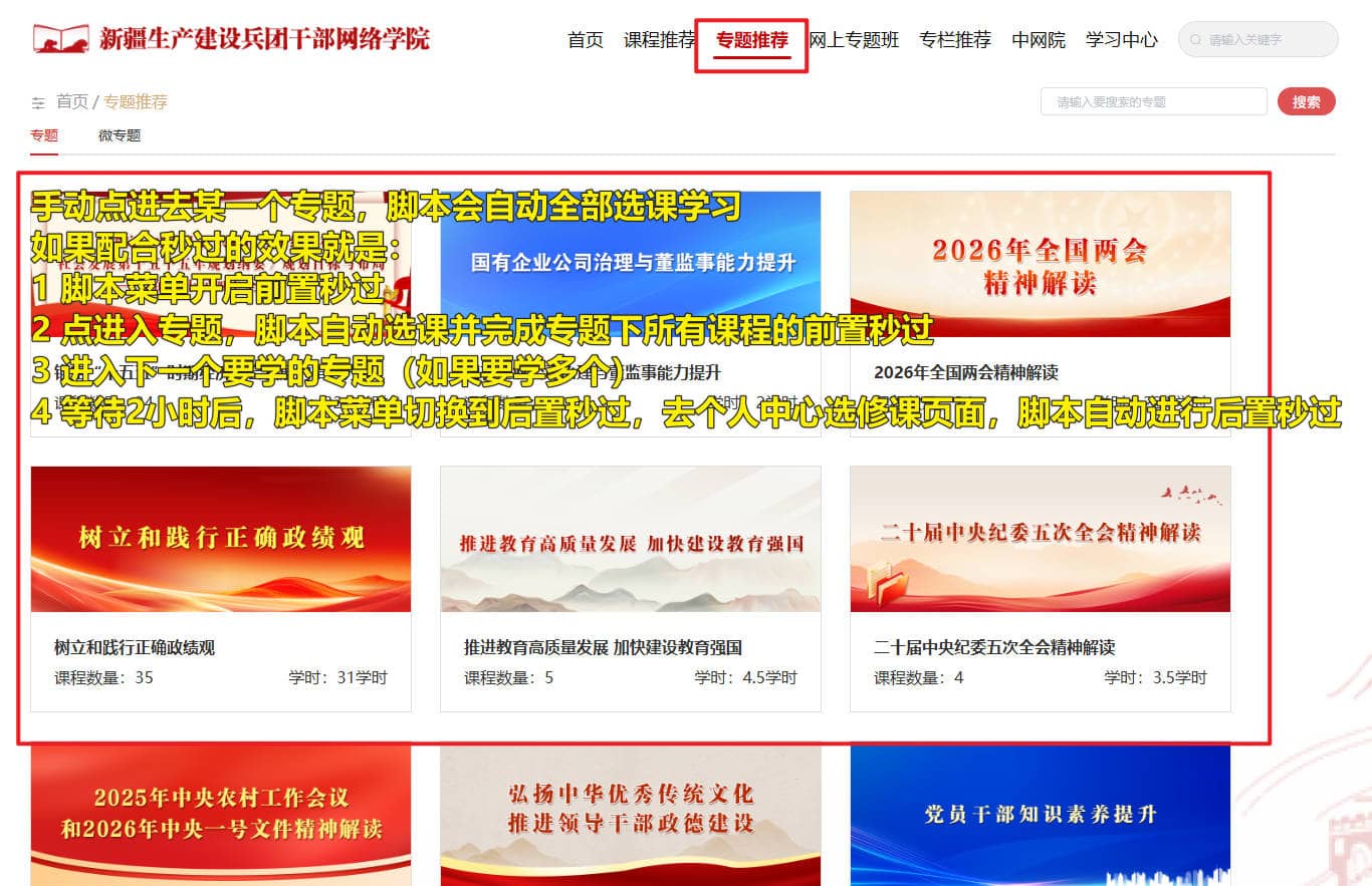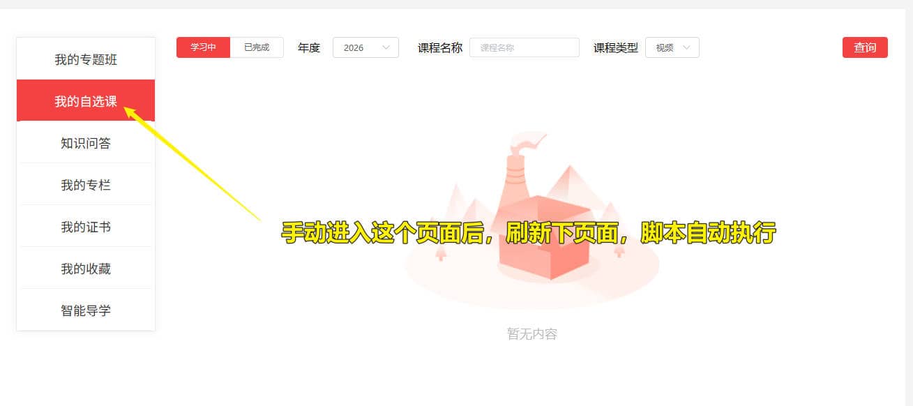 安装好脚本后,刷新下浏览器。在获取脚本后(自助购买或联系客服授权),手动进入学习中心-我的专题班,脚本自动启动。